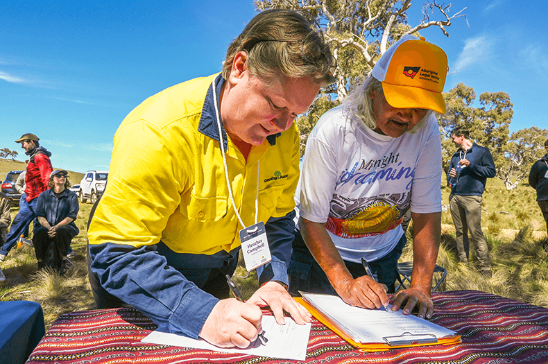 With these important partners looking on, Wolgalu and Wiradjuri Elder Aunty Alice Williams (representing Wolgalu Nyadinang Najung corporation) and Greening Australia CEO Heather Campbell took turns to sign on the dotted line.