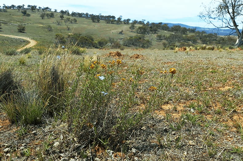 A surprising bonus, given the long history of sheep grazing here, is that some of the native grassland diversity still remains. Besides the wallaby and spear grasses, there are small shrubs such as bossiaeas and scattered native wildflowers like Austral bear’s ears, common everlasting, scaly buttons and sunrays.
